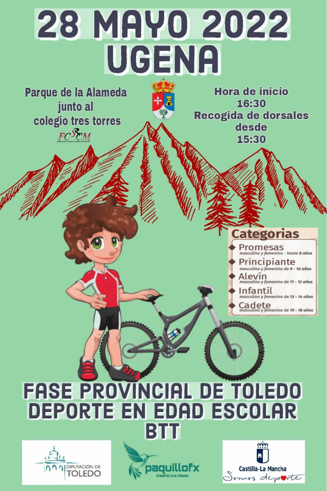 Tras dos años de obligado parón por la pandemia del coronavirus, localidad toledana de Ugena retoma su compromiso con el BTT escolar acogiendo el próximo sábado 28 de mayo su II Carrera MTB Escuelas Ugena, cuarta cita puntuable de la Fase provincial del Deporte en Edad Escolar BTT de Toledo, de la Delegación provincial de Deporte de la JCCM. La prueba es además la competición previa al Campeonato de Castilla-La Mancha que se celebrará el próximo 12 de junio en Olmeda del Rey, lo que servirá para comprobar el estado de forma con el que llegan los escolares a la cita regional.