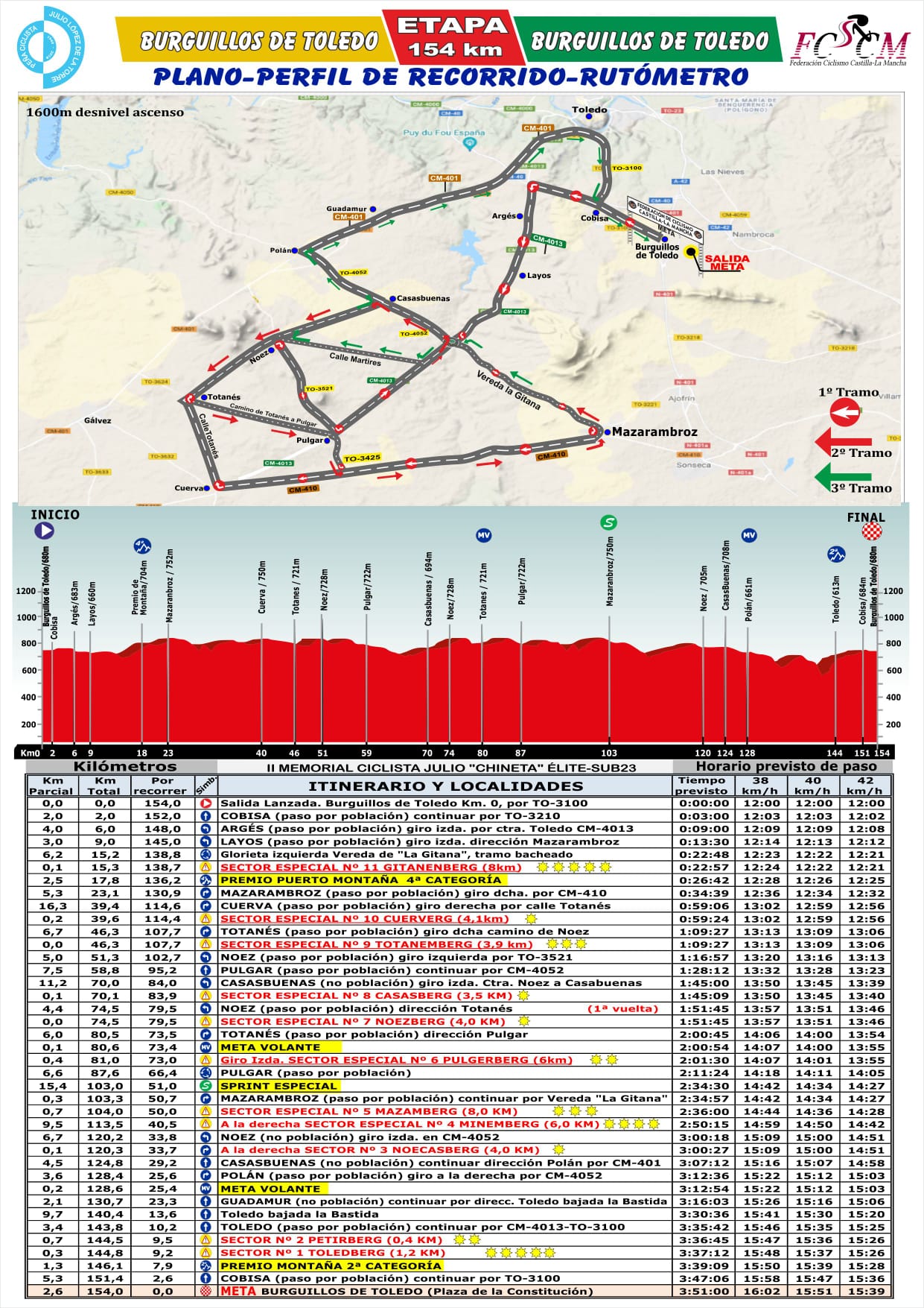 El Memorial tendrá paso por los términos de Burguillos, Cobisa, Argés, Layos, Mazarambroz, Pulgar, Casasbuenas, Noez, Polán, Guadamur y Toledo, localidades que ya se han implicado directamente en la promoción de la prueba. Los ciclistas se enfrentarán también a dos puertos de montaña puntuables en el tramo 11 inicial (Vereda de la Gitana, de 2ª categoría) y en el tramo 1 final (km 146, 4ª categoría). Habrá además un Sprint Especial y dos metas volantes.