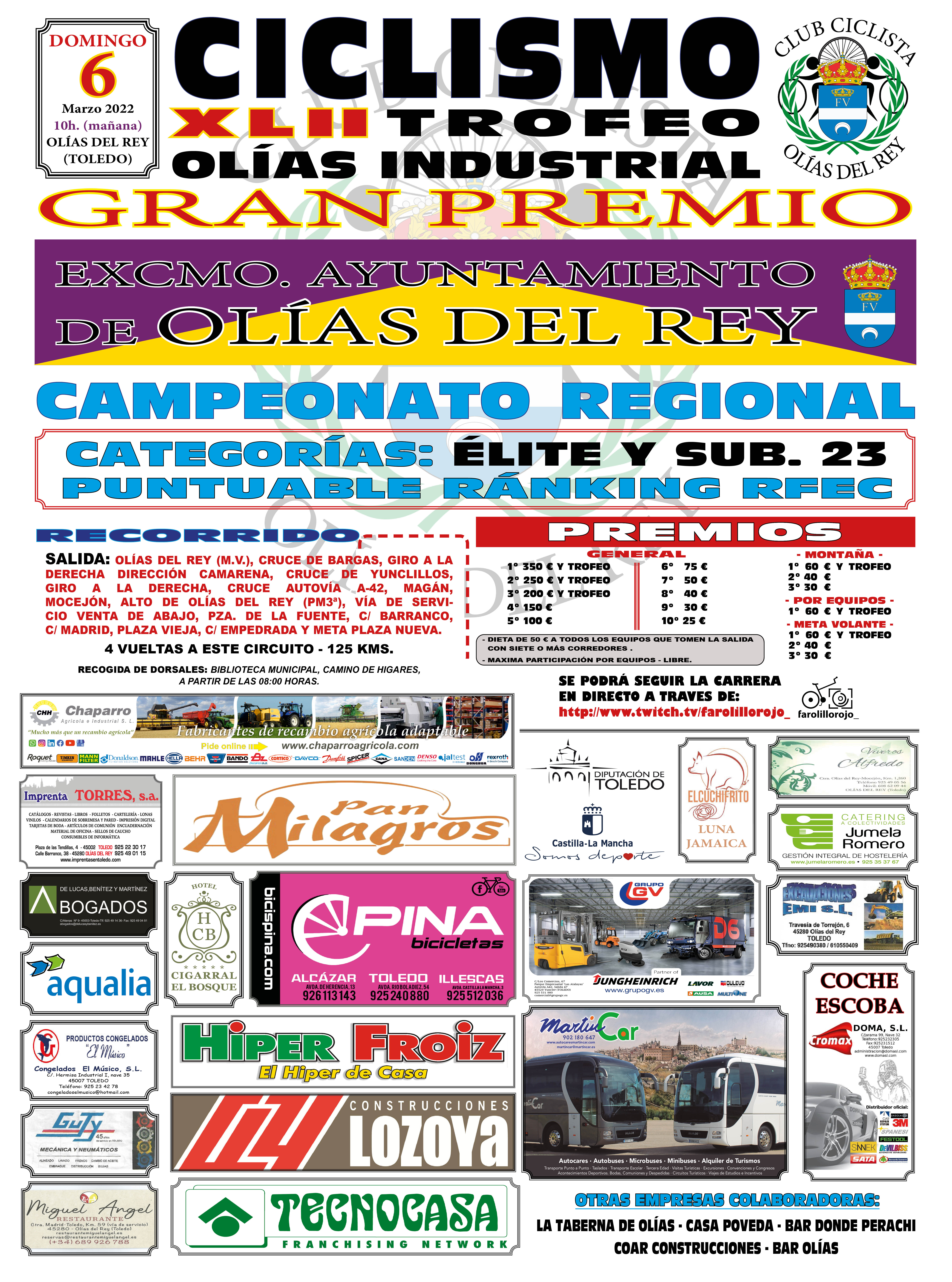 El Club Ciclista Olías del Rey ya tiene todo preparado para acoger este domingo 6 de marzo, a partir de las 10 de la mañana, el Campeonato de Castilla-La Mancha élite y sub23 2022 enmarcado por la XLII edición de su Trofeo Olías Industrial, una de las clásicas de la región que nacía en los 80 de la mano de Federico Martín Bahamontes y su peña en una implicación personal del ciclista toledano que se prolongaría durante más de 30 años. La carrera es puntuable para el ranking de la RFEC.