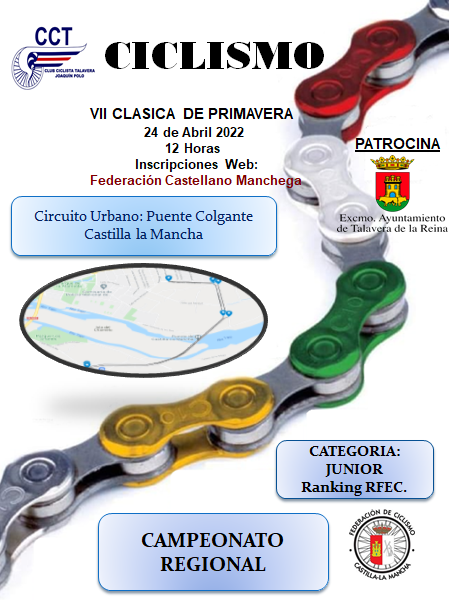 La localidad de Talavera de la Reina (Toledo) será sede el próximo domingo 24 de abril de la VII Clásica de Primavera, prueba ciclista junior organizada por el Club Ciclista Talavera Joaquín Polo que albergará el Campeonato de Carretera de Castilla-La Mancha para la categoría. Además, será puntuable para el ranking de la RFEC.