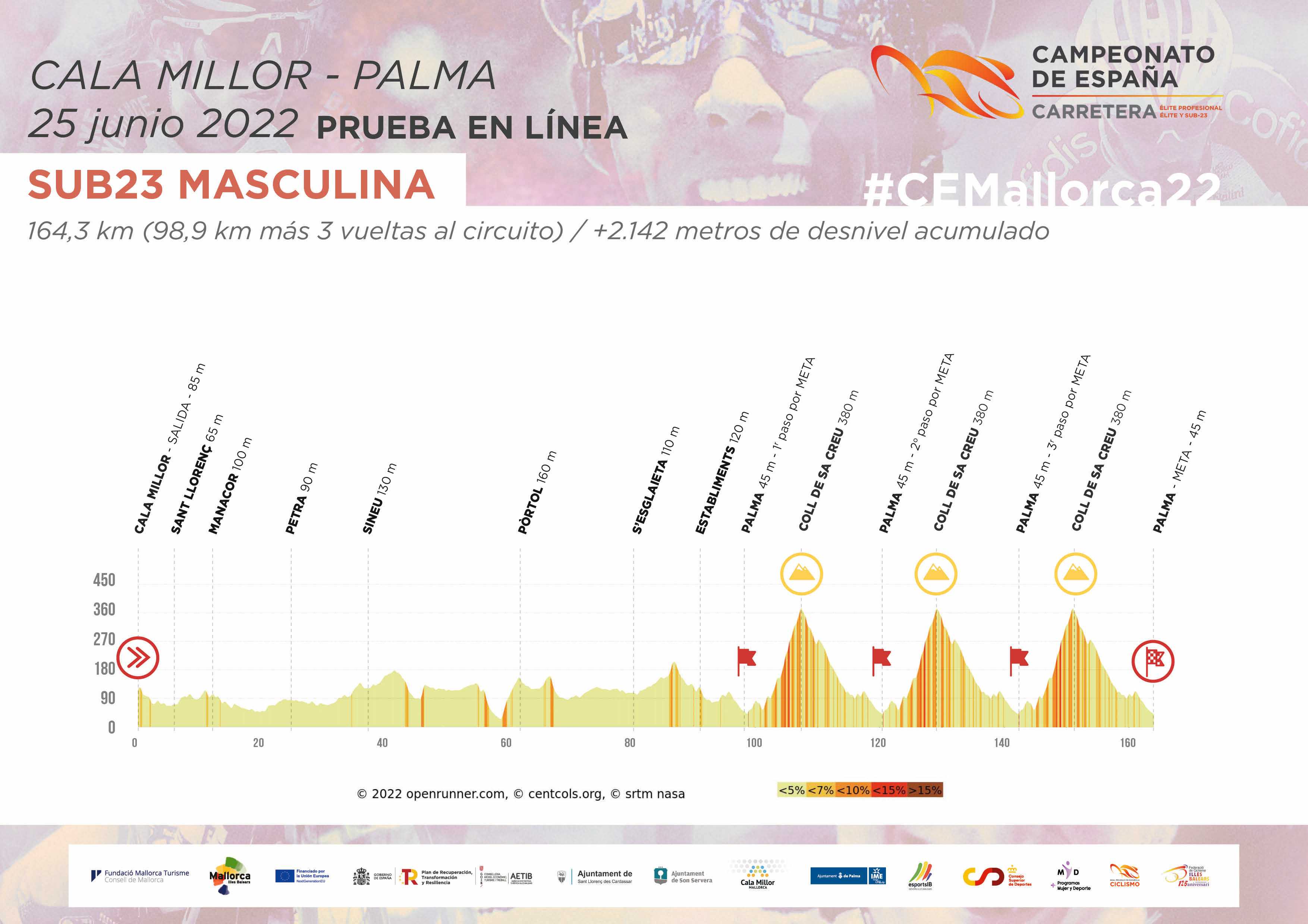 Los chicos sub23 realizarán un primer tramo inicial algo más largo, de 98 kilómetros, puesto que la salida se efectuará desde Cala Millor, para llegar al mismo circuito de Palma, sobre el que realizarán tres giros con sus respectivos pasos por el Coll de Sa Creu.