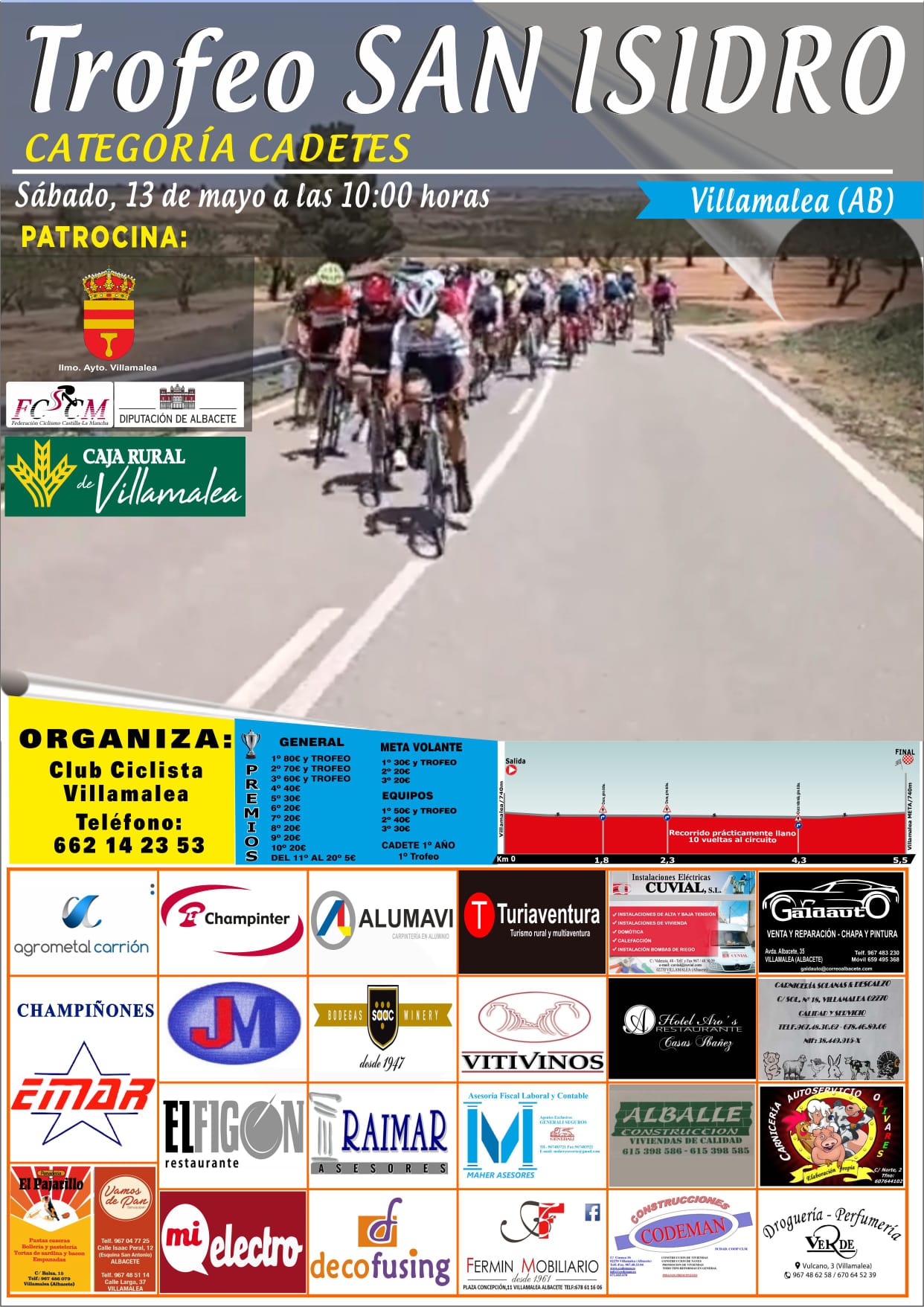 Todo listo en Villamalea (Albacete) para acoger este sábado 13 de mayo, a partir de las 10 horas, el Trofeo San Isidro 2023 Cadetes para el que se espera una participación superior al centenar de ciclistas. La prueba está organizada por el Club Ciclista Villamalea y patrocinado por el ayuntamiento de la localidad y la Fundación Caja Rural de Villamalea, contando con la colaboración de la Federación de Ciclismo regional y la Diputación de Albacete.
