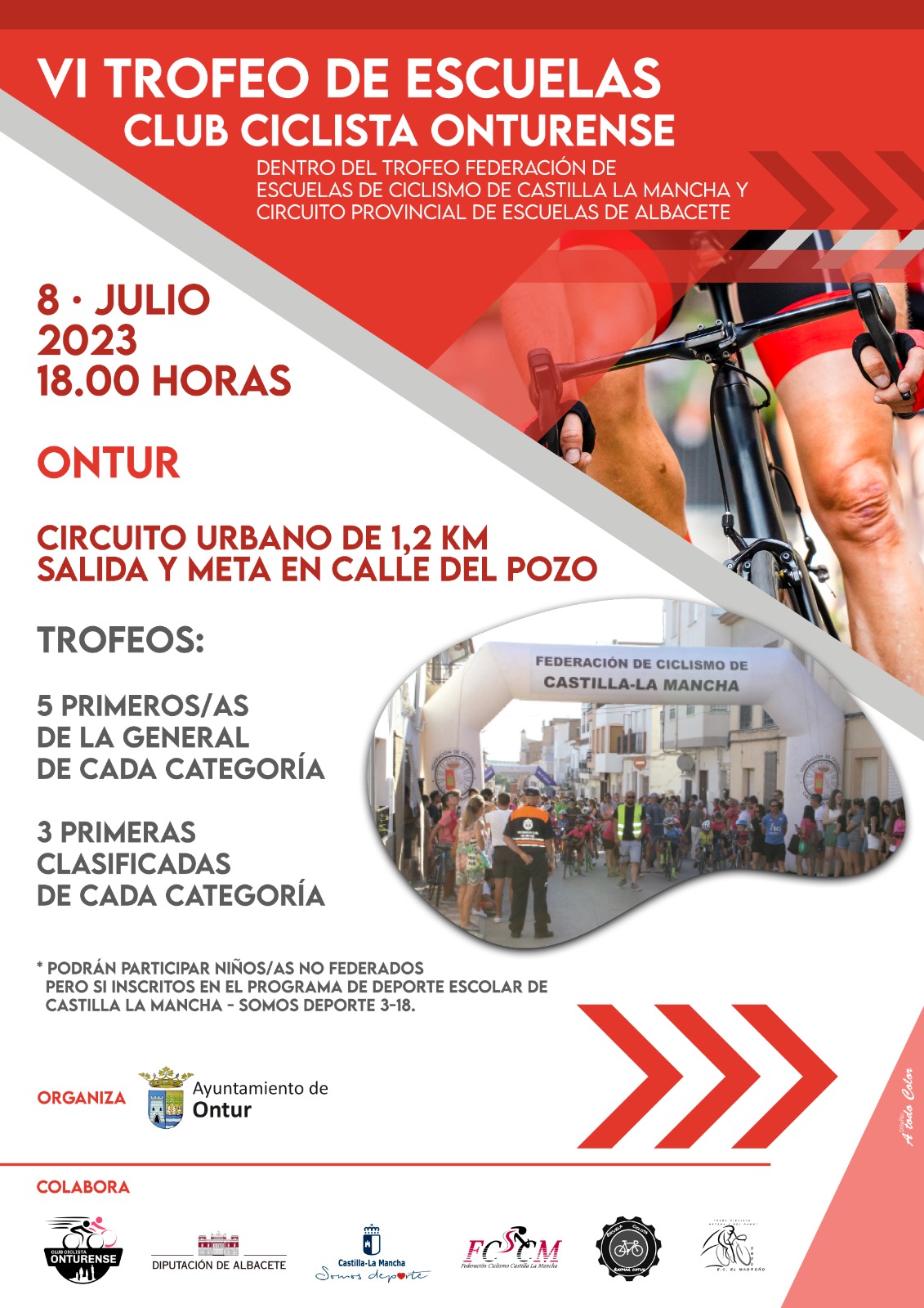 La localidad de Ontur (Albacete) acogerá este sábado 8 de julio, a partir de las 18 horas, una nueva edición de su Trofeo de Escuelas Club Ciclista Onturense, en el que se espera la participación de cerca de un centenar de jóvenes ciclistas llegados de las escuelas regionales y de clubes de provincias limítrofes, como Murcia. También podrán participar niños y niñas no federados, pero sí inscritos en el programa de Deporte en Edad Escolar de Castilla-La Mancha Somos Deporte.
