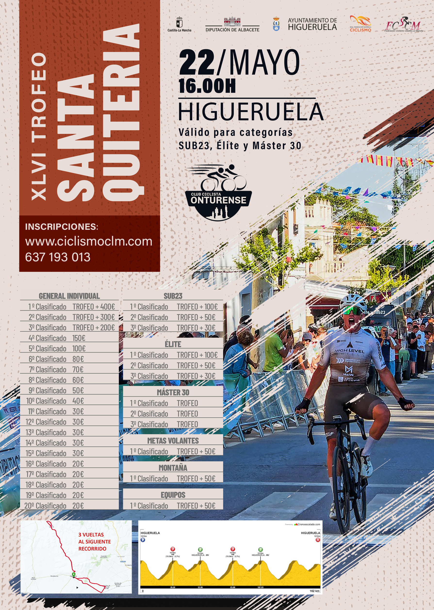 Higueruela celebrará el día grande de su patrona, Santa Quiteria, de nuevo con una prueba ciclista que reunirá en la población albaceteña a más de 120 corredores llegados sobre todo de equipos de Castilla-La Mancha y comunidades cercanas, como Murcia, Comunidad Valenciana… Una participación muy alta considerando que el jueves 22 de mayo no es festivo, y que habla de la importancia que los ciclistas conceden a esta carrera para élites, sub23 y Máster 30. En su extenso palmarés cuenta con figuras como Felipe Orts, Eusebio Pascual, Aitor Escobar, José Manuel Díaz Fenoll, Eric Martin, Pol Hervás, Jordi Artigues… todos vencedores en la última década, con doblete para Orts.