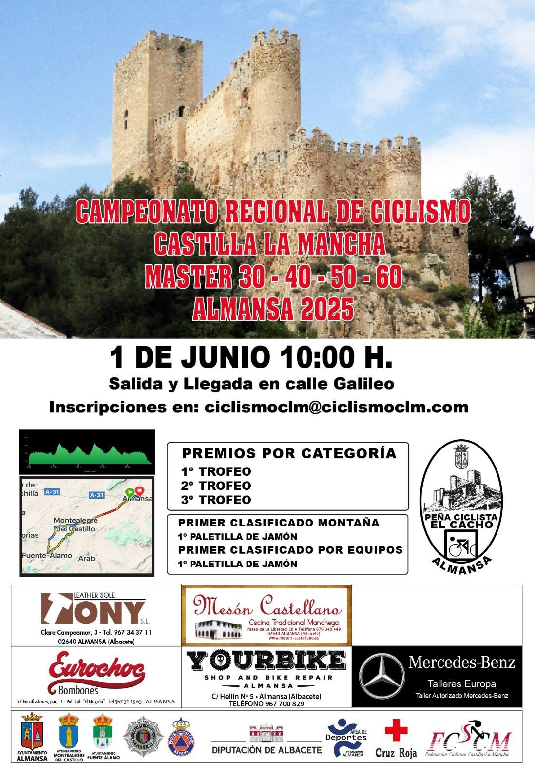 La Peña Ciclista El Cacho organiza en Almansa el Campeonato de Castilla-La Mancha Máster 2025 en una prueba de carretera que tendrá lugar el próximo domingo 1 de junio, a partir de las 10 horas. La prueba está dirigida a categorías Máster 30, 40, 50 y 60. El club organizador ha contado con la colaboración del Ayuntamiento de Almansa, Diputación de Albacete, Federación de ciclismo regional y los consistorios de Montealegre del Castillo y Fuente Álamo, además de numerosas firmas comerciales, fundamentales en el patrocinio de la carrera.