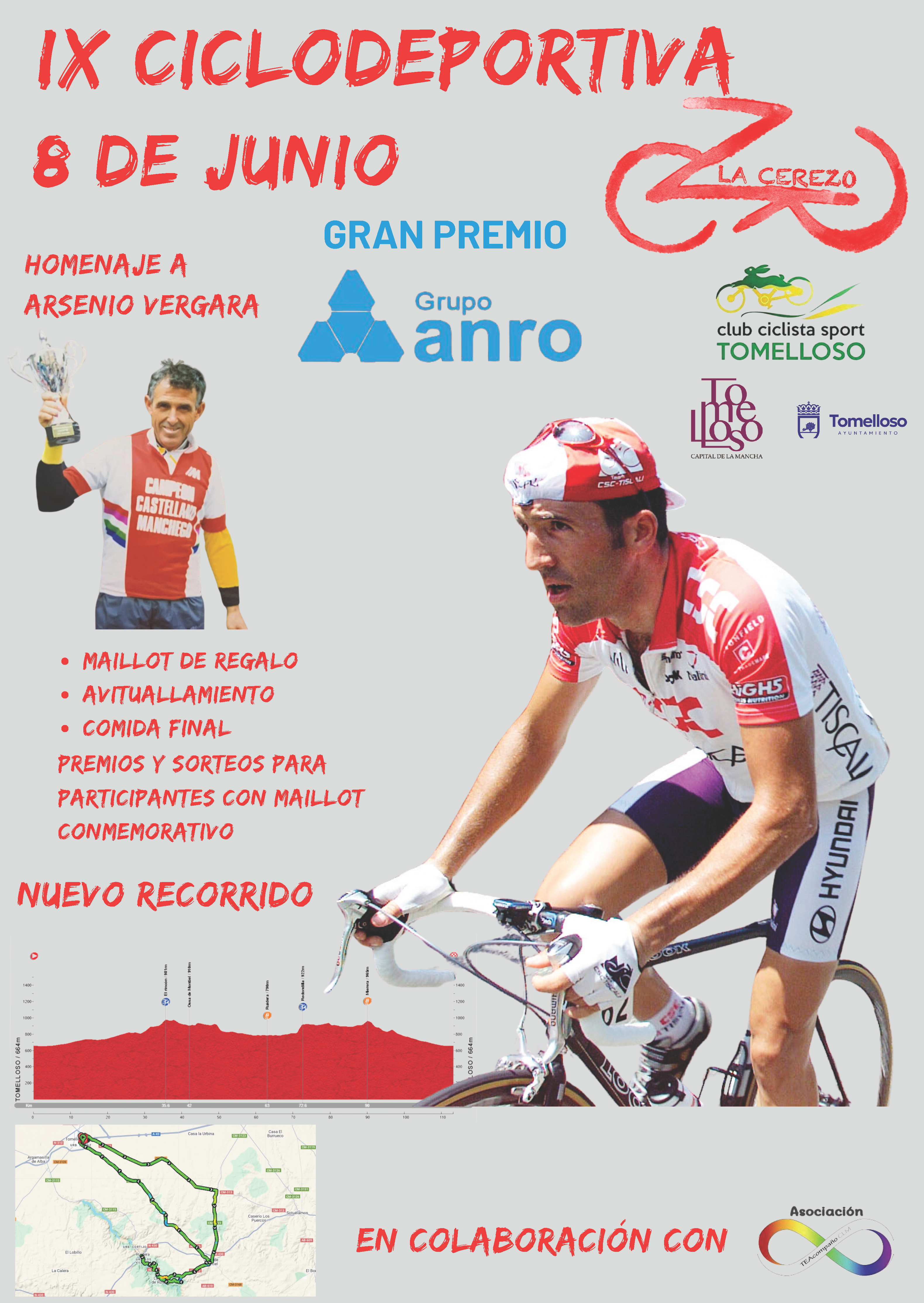 El Club Ciclista Sport Tomelloso culminará muchos meses de trabajo este domingo 8 de junio, cuando la Ciclodeportiva La Cerezo comience a rodar por las carreteras de La Mancha en su novena edición, segunda de la nueva junta directiva del club. La Marcha, dirigida a las categorías desde sub23 hasta máster, llega al 2025 consolidada en el calendario y como uno de los referentes del cicloturismo regional. Con más de 180 inscritos y un notable aumento de participación femenina, la Cicloturista contará en su parrilla con invitados de nivel que destacaron en el ciclismo profesional, como José Herrada, Isaac Cantón o Jesús Alberto Rubio. Y no podía faltar la presencia de Paco Cerezo, exciclista de Tomelloso que da nombre a esta prueba que rinde homenaje a su larga trayectoria de once años en el ciclismo profesional.