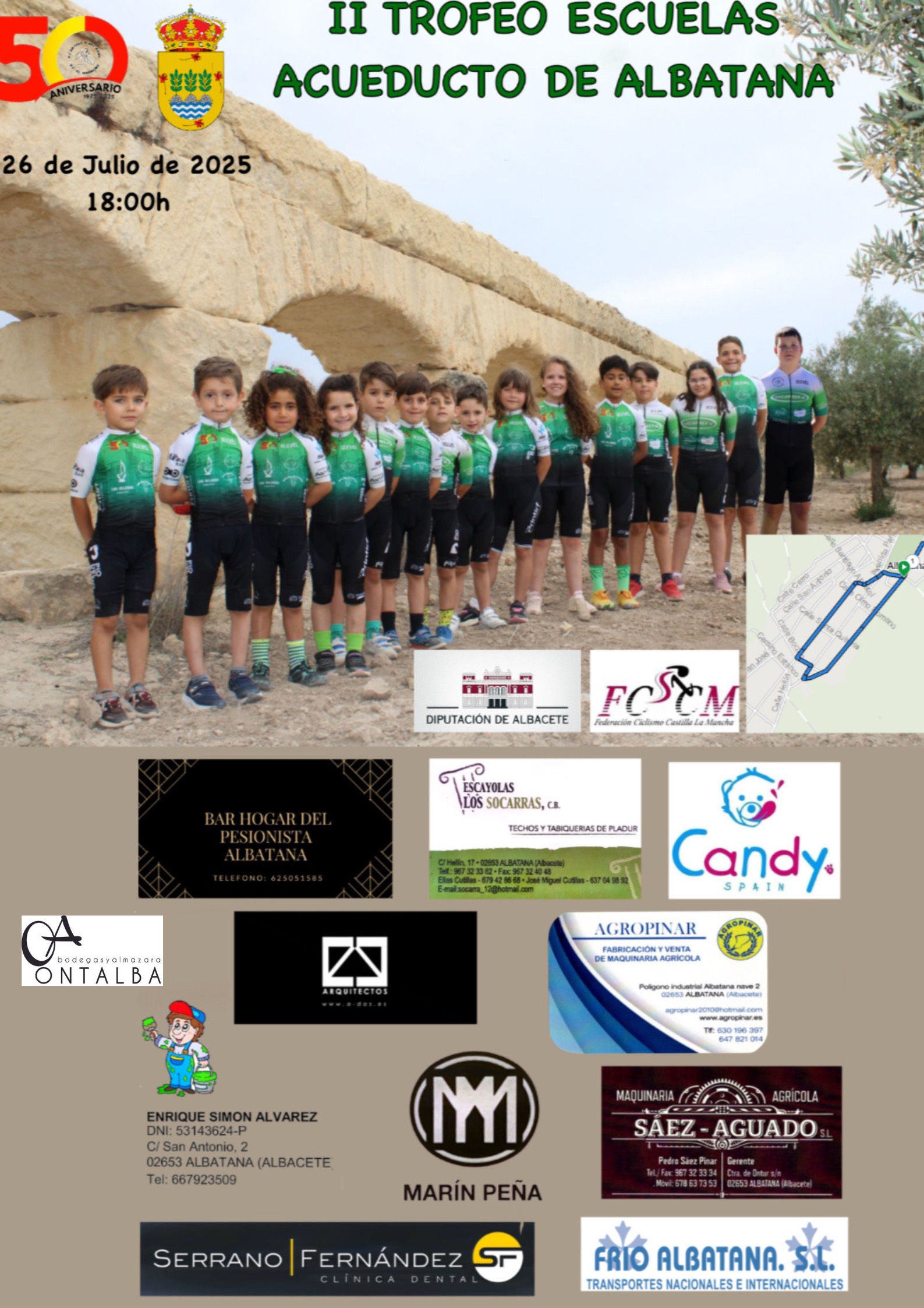 La Peña Ciclista Ortega y del Ramo, de Ontur, organiza la segunda edición de una carrera de ciclismo escolar que nació el año pasado como un novedoso modo de aunar deporte y desarrollo rural: El Trofeo Acueducto de Albatana. Tendrá lugar el próximo sábado 26 de julio, a partir de las 18 horas, en la localidad de Albatana (Albacete). A la organización se suma el Ayuntamiento de Albatana, con la colaboración de la Diputación de Albacete.