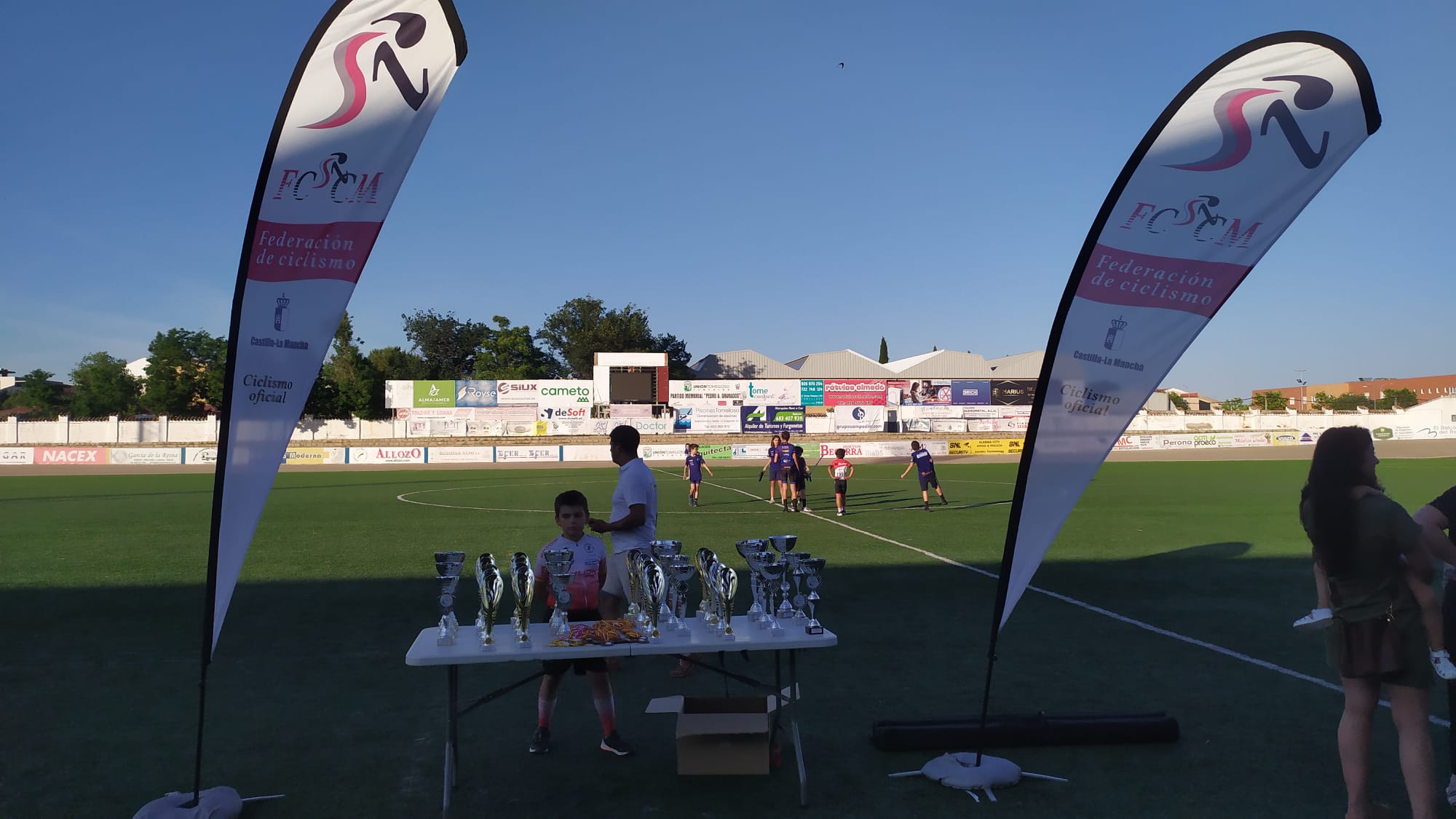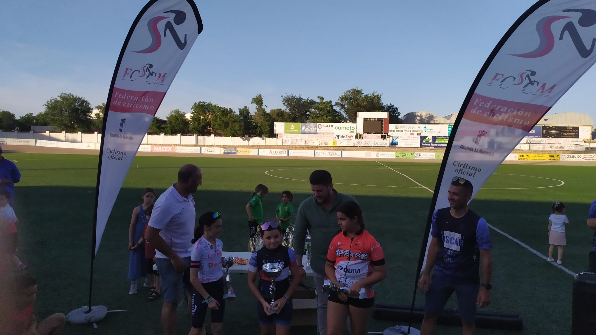 En la entrega de trofeos participaron Paco Cerezo, presidente del club organizador y vicepresidente de la Federación de Ciclismo regional, Manuel Marquina, concejal de festejos del Ayuntamiento de Tomelloso, Jesús Lara, concejal de agricultura y medio ambiente, y Óscar Castillejos, del club organizador y seleccionador regional de Escuelas.