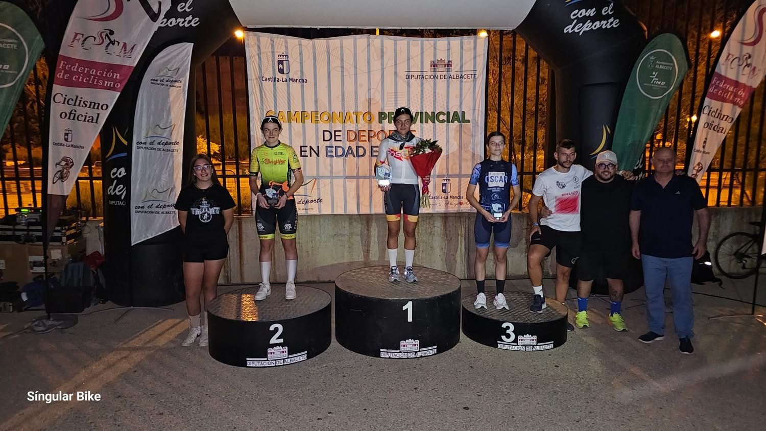 En la entrega de Trofeos, dos de los fundadores del nuevo club Escuela Ciclista Ciudad de Albacete, Antonio Galdón y José Manuel García, que estuvieron acompañados por todo un referente del ciclismo albaceteño: Héctor Carretero, de Madrigueras, exciclista profesional muy vinculado al nuevo proyecto del equipo cadete del club, el Dipualba-Arcos Team.
