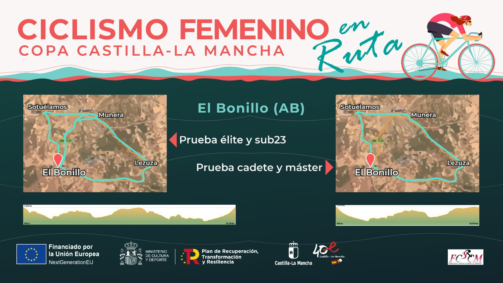 La localidad albaceteña de El Bonillo acogerá el próximo sábado 11 de marzo la prueba inaugural de la I Copa Castilla-La Mancha de Ciclismo Femenino en Ruta, un hito en el futuro del ciclismo de la región, tal como se anunciaba desde Federación en su presentación oficial hace un mes, puesto de dará un impulso al ciclismo femenino castellanomanchego, aún muy minoritario en relación con el masculino, pero que ahora ya cuenta con un calendario de carreras más amplio que ayude a consolidar la trayectoria deportiva de las ciclistas y de los equipos femeninos.