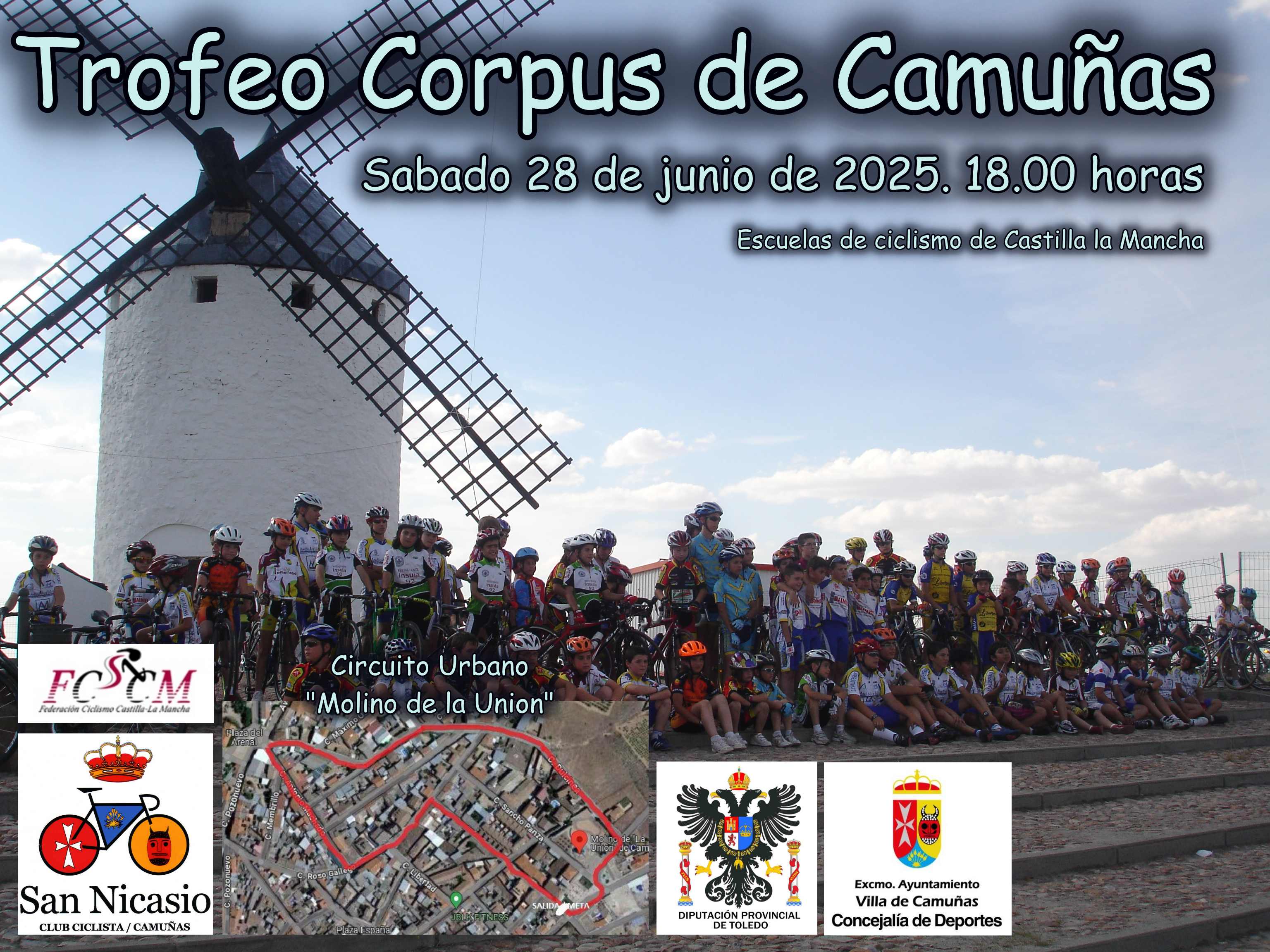 En el marco de una de las fiestas más singulares del calendario castellanomanchego, la de los Pecados y Danzantes del Corpus Christi de estos días, los escolares del ciclismo regional vuelven a Camuñas (Toledo) en una nueva cita del Trofeo Federación de Castilla-La Mancha. El Trofeo Corpus de Camuñas atesora una larga trayectoria, tal como recuerdan los actuales miembros del club organizador, el Club Ciclista San Nicasio, que ya corrían esta carrera de niños. A la organización se suma también el Ayuntamiento de Camuñas y cuentan con el apoyo de la Diputación de Toledo.