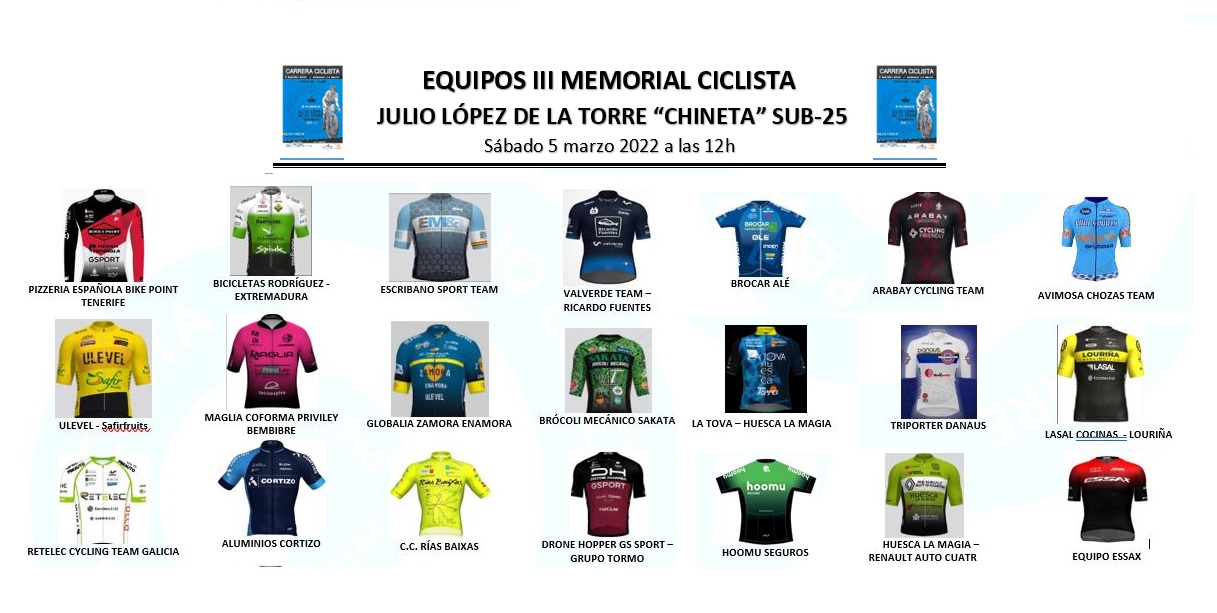 Organizado por la Peña Ciclista Julio López de la Torre “Chineta”, el Memorial mantiene su principal valor y objetivo fundacional: apoyar y fomentar el ciclismo base en las categorías previas a la etapa profesional, para las que no hay prácticamente carreras organizadas. La prueba recibirá a veintiuna de las principales escuadras del pelotón nacional, que llegan a este Memorial por invitación. Pero además, la organización ha dado cabida a los corredores que han subido de categoría junior, que se encuentran sin equipo y están buscando escuadra amateur. Entre los equipos confirmados, Tenerife BikePoint Pizzería Española, Bicicletas Rodríguez Extremadura, Escribano Sports Team, Valverde Team, Brocar Ale, Arabay Cycling Team, Avimosa Chozas, Ulevel, Maglia Coforma, Globalia Zamora, Brócoli Mecánico, La Tova Huesca, Triporter Danaus, Lasal Cocinas Lauriña, Retelec Cycling Team Galicia, Aluminios Cortizo, Rías Baixas, Drone Hooper GS Sport, Hoomu Seguros, Huesca La Magia Renault y Essax.
