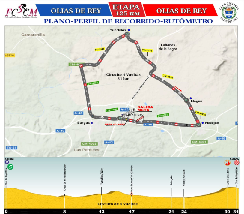 El Trofeo Olías Industrial, que cerró inscripciones hace más de un mes debido a la alta demanda, espera a doscientos ciclistas y dieciséis escuadras llegadas de toda España. Respecto al recorrido, prácticamente llano, mantiene la propuesta de ediciones anteriores: 125 kilómetros y cuatro vueltas a un circuito, con salida y llegada en Olías, que llevará a los corredores a través de los términos municipales de Bargas, Yunclillos, Mocejón y Magán. El Alto de Olías del Rey (3ª categoría) será puntuable para el Premio de Montaña en las tres primeras vueltas. La Meta Volante puntuable estará ubicada en las calles de Olías del Rey.