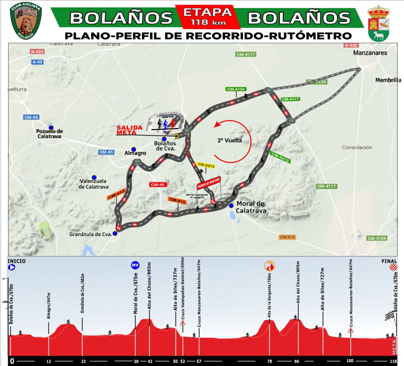 La carrera comenzará a las 10 de la mañana, con salida y llegada en la calle Daimiel. El trazado mantiene el recorrido de ediciones anteriores, avalado por las buenas críticas cosechadas entre los participantes. En total, 120 kilómetros y paso por los términos de Almagro y Granátula. Los ciclistas cruzarán por las calles del Moral, donde estará ubicada la Meta Volante, puntuable al primer paso (Km. 35). Las dificultades montañosas se encontrarán en las subidas al Alto del Chozo, al Alto de Siles y al Alto de la Garganta, de 750 metros, donde estará ubicado el único Premio de Montaña puntuable de la jornada (Km. 75).