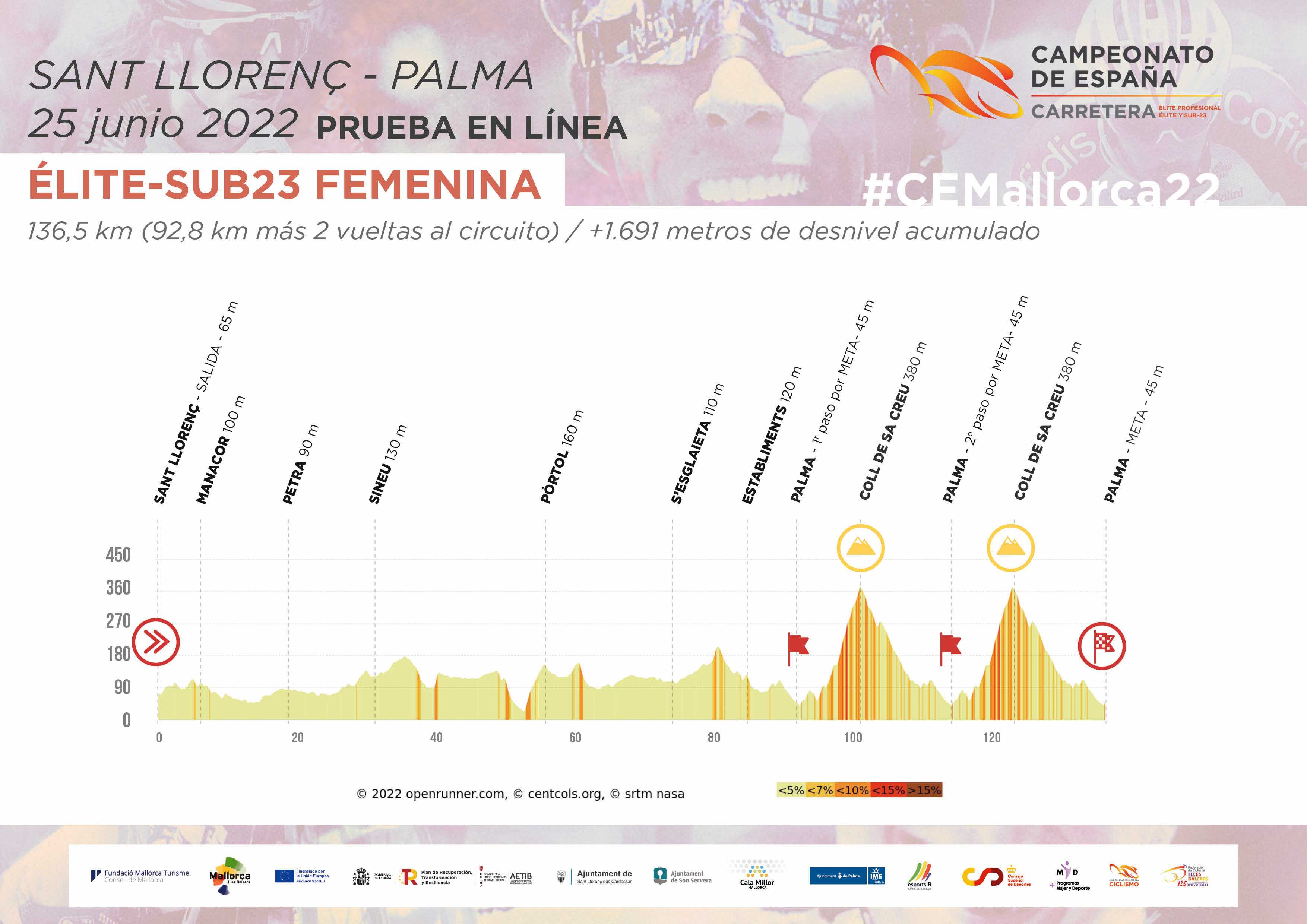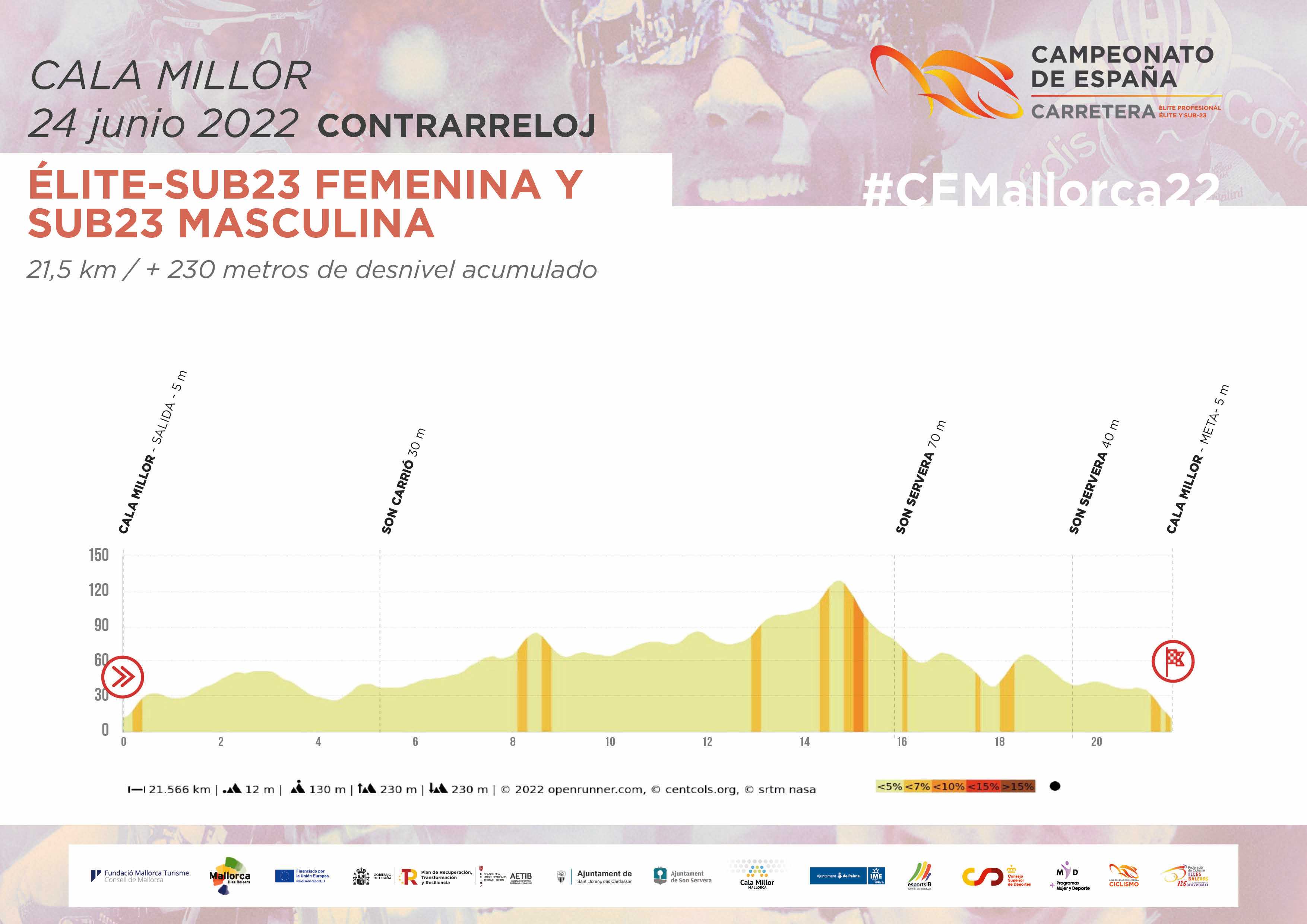 El sábado 25 de junio se celebrarán las pruebas en línea para los sub23 de la selección. Marta Rosillo tomará la salida en Sant Llorenç y desde allí afrontará un primer tramo de 92 km que las conducirá hasta el circuito de Palma, de 21,8 km, al que se darán dos vueltas antes de encontrar la línea de meta. En este circuito encontrarán un doble ascenso al Coll de Sa Creu, de unos 6 kilómetros con una pendiente media ligeramente superior al 5%, pero que en algunos tramos cuenta con rampas que superan el 10%. La carrera élite/sub23 femenina podrá seguirse en directo a través del canal Youtube de la RFEC y de Eurosport.