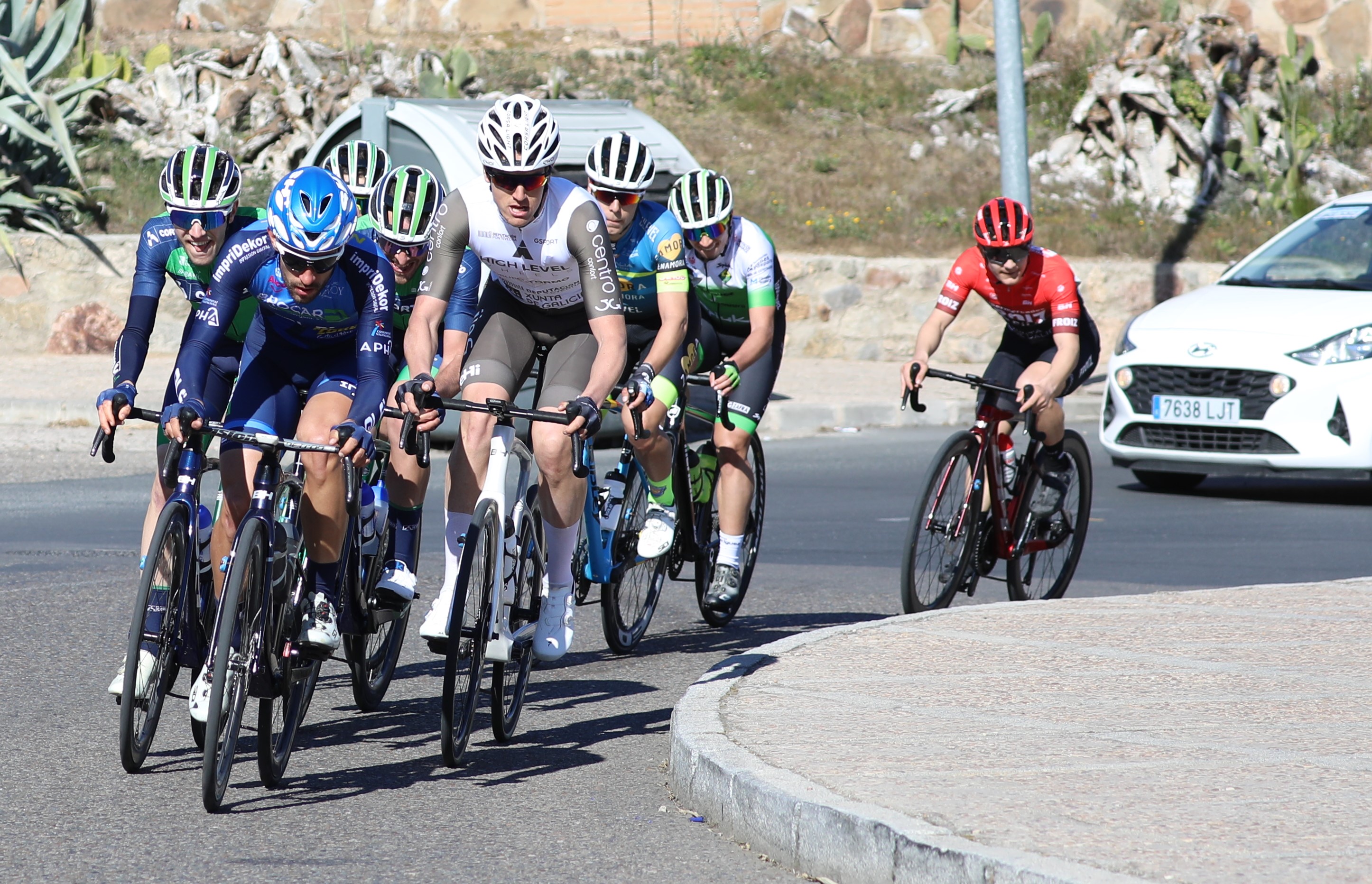 se veía que había realizado una apuesta muy valiente de intentar ganar en solitario. Pronto saldríamos de dudas... antes de Cobisa a menos de 5km la excelente dupla perseguidora se convertía en trío después del esfuerzo al límite para dar caza al escapado y con este gran trío se presentaban en el sprint final en Burguillos de Toledo. Faltaban los 200 m. a meta y el primero en adelantarse fue el corredor de Cortizo por el lado derecho. En el sentido de la carrera, a su izquierda, el corredor del High Level y, justo detrás, el corredor del Arabay entre los dos, vigilaba pendiente de qué rueda sería la buena.