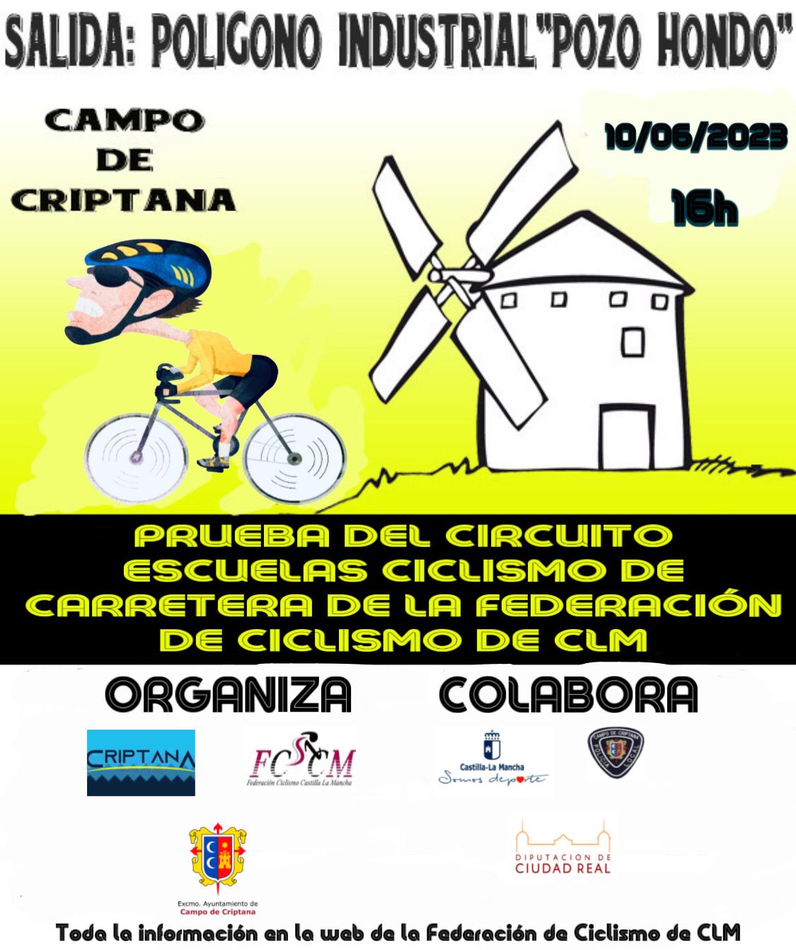 Campo de Criptana se estrena en el calendario del Trofeo Federación de Escuelas Ciclistas de Castilla-La Mancha 2023 con su 1ª Prueba de Carretera Tierra de Gigantes. Será el próximo sábado 10 de junio, finalmente a partir de las 17 horas, de la mano del Club Deportivo Criptana Pro Team Cycling y el Ayuntamiento de la localidad, en la organización.