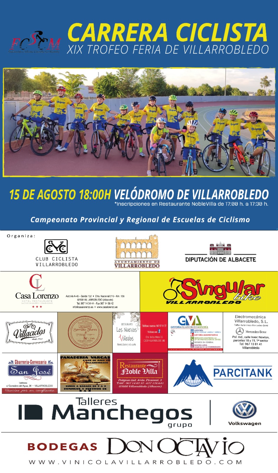 El Trofeo Feria de Villarrobledo para escuelas cumple el martes 15 de agosto diecinueve ediciones apoyando el ciclismo base de Castilla-La Mancha enmarcado en las fiestas patronales de esta localidad albaceteña que se celebrarán del 14 al 18 de agosto. La competición está integrada en el Trofeo Federación regional para escuelas y es puntuable además para el Campeonato en Edad Escolar de Albacete.