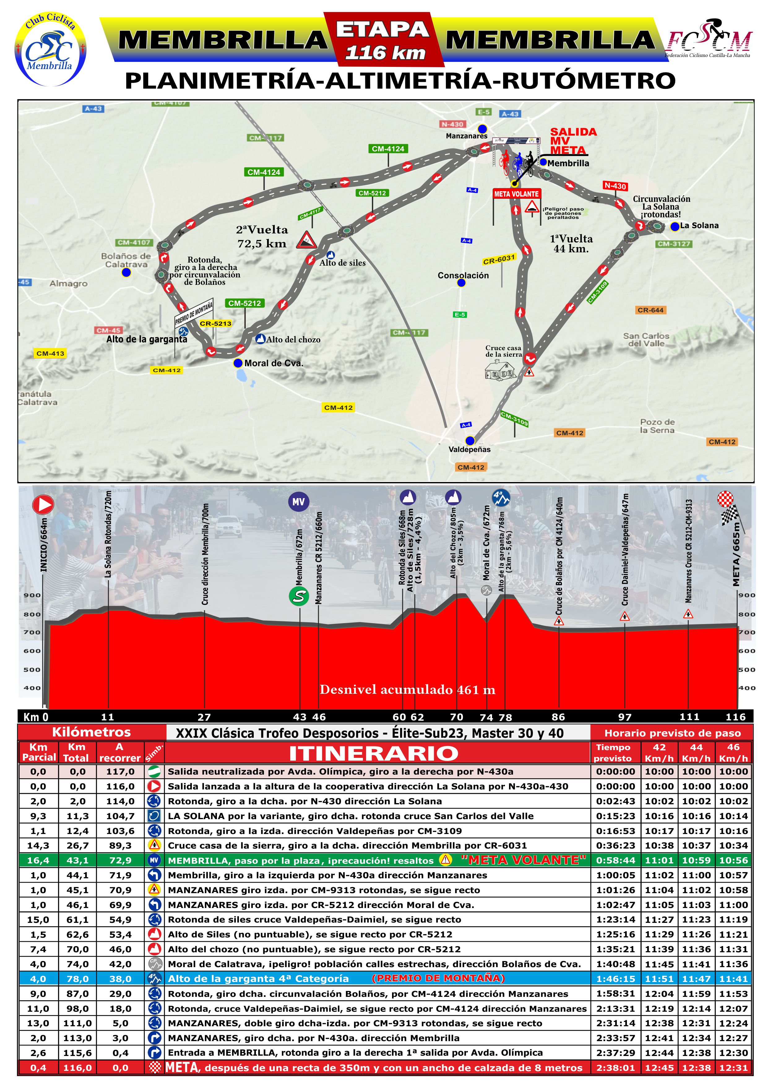 Tras el corte de cinta protocolario, la carrera arrancará desde la Avenida Olímpica a las 10 de la mañana para recorrer un primer circuito de 44 km con paso por La Solana y la Casa de La Sierra, donde se girará a la derecha para regresar a Membrilla. En el primer paso por la localidad, en la Plaza del Azafranal, estará situada la Meta Volante puntuable.