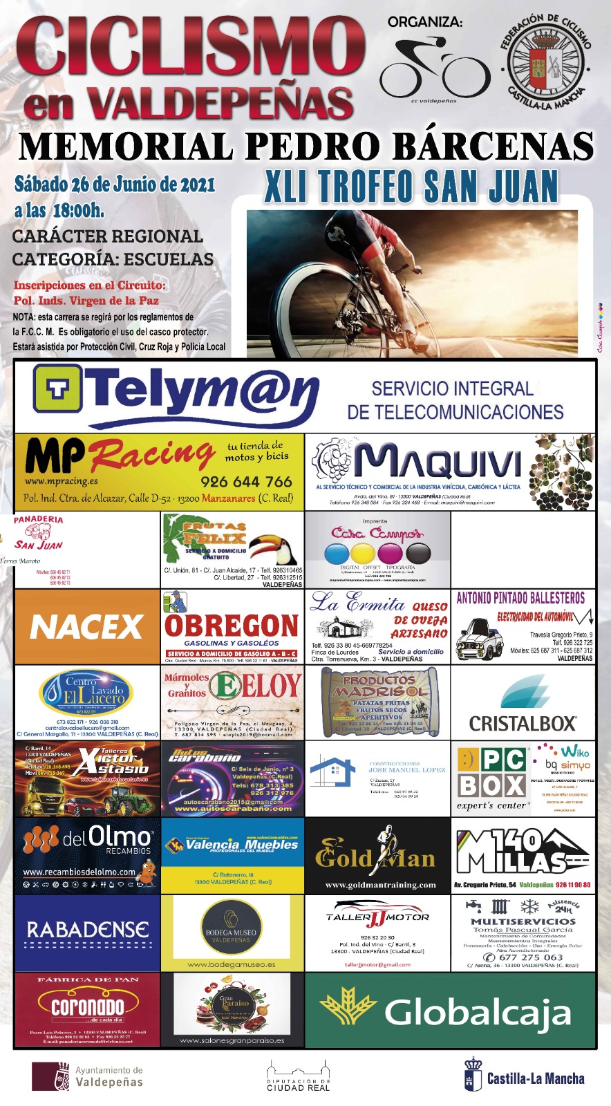 Las inscripciones pueden hacerse en la web de la Federación de Ciclismo de Castilla-La Mancha hasta el viernes 25: https://yosoyciclista.com/index.php/smartweb/inscripciones/inscripcion/18453-XLI-TROFEO-SAN-JUAN-MEMORIAL-PEDRO-BARCENAS-LOPEZ