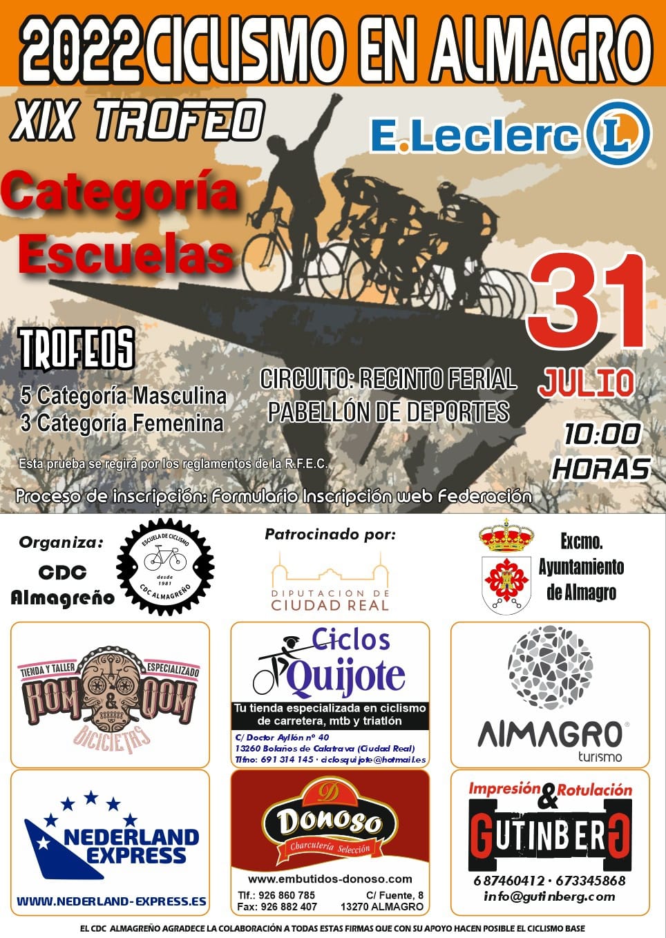 El Trofeo Federación de Escuelas de Ciclismo 2022 llega a su ecuador este domingo en la localidad de Almagro (Ciudad Real) con la disputa del Trofeo E.Leclerc, uno de los más veteranos de la competición, que este año cumple su edición número diecinueve bajo la organización del Club Ciclista Almagreño. Por esta razón, desde el club subrayan el agradecimiento al centro comercial, ya que pocas marcas siguen apoyando una competición durante tantos años, de manera ininterrumpida, permitiendo el crecimiento deportivo de la cantera del ciclismo regional.