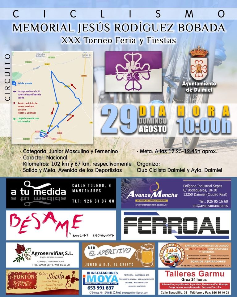 El Club Ciclista Daimiel recupera la actividad ciclista con el clásico Trofeo Ferias y Fiestas para categoría Junior, de carácter nacional, que en su 30 edición estará dedicado a la figura de Jesús Rodríguez Bobada, fallecido el pasado mes de septiembre; un merecido homenaje póstumo a la persona que estuvo al frente del Club Ciclista Daimiel durante más de dos décadas. La carrera tendrá lugar el próximo domingo 29 de agosto, a las 10 horas, con salida y meta en la Avenida de los Deportistas.