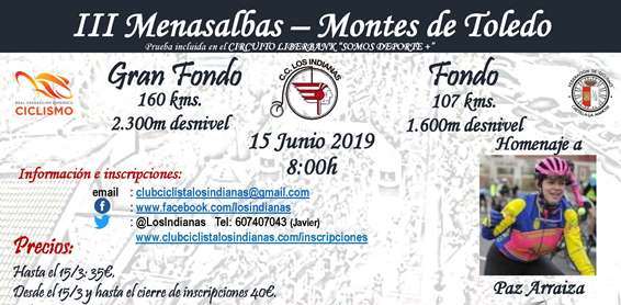 La Marcha Ciclodeportiva Fondo y Gran Fondo Menasalbas- Montes de Toledo organizada por el Club Ciclista Los Indianas se consolidaba en el calendario nacional del cicloturismo con sólo tres ediciones a sus espaldas tras acoger el pasado sábado a seiscientos ciclistas llegados de toda España. Un éxito de convocatoria que viene avalado por el gran trabajo realizado desde el Club Ciclista Los Indianas, organizador del evento, con la única pretensión de conseguir la diversión del ciclista bajo unos parámetros máximos de seguridad, y donde la única competición premiada se encuentra en la cronoescalada del Puerto del Robledillo.