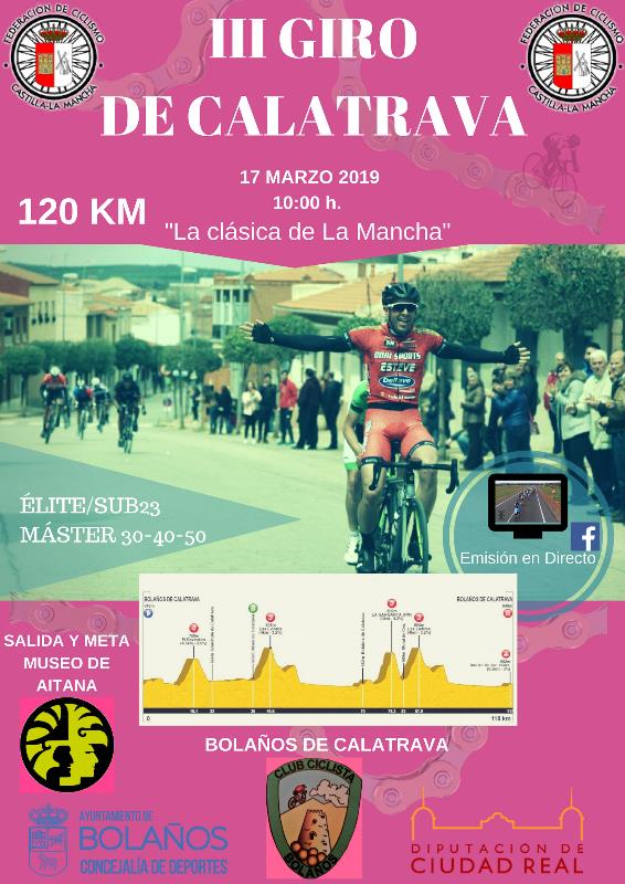 Bolaños (Ciudad Real) acogerá el próximo domingo 17, a partir de las 10 de la mañana, el III Giro de Calatrava, prueba de carretera para élites, sub23 y Másters organizada por el Club Ciclista Bolaños que en sólo tres años ha conseguido consolidarse en el calendario ciclista de la zona centro, duplicando sus cifras de participación hasta acercarse a los doscientos inscritos en estas semanas previas.